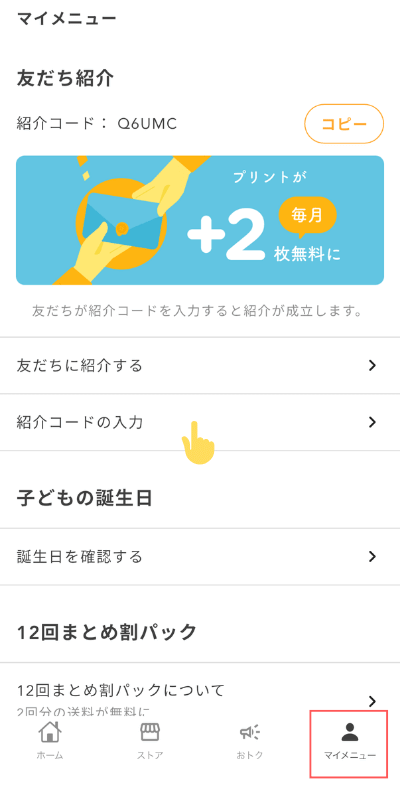 マイメニュー内に「紹介コードを入力」という項目があるので、そこから入力画面に進みます。