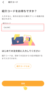 Fammプリントでは、注文後10日以内であれば紹介コードを入力できます。