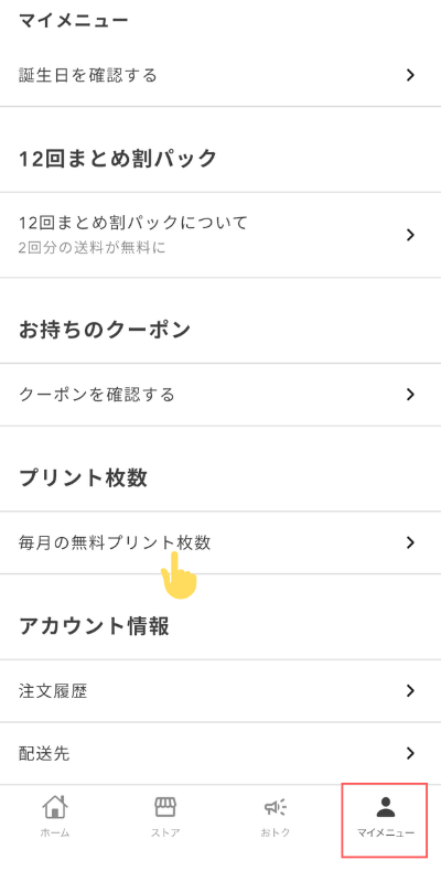 マイメニューから「毎月の無料プリント枚数」を開くと、