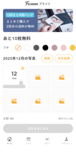 Fammプリントの紹介コードは、写真を選んで注文する画面では入力しません。